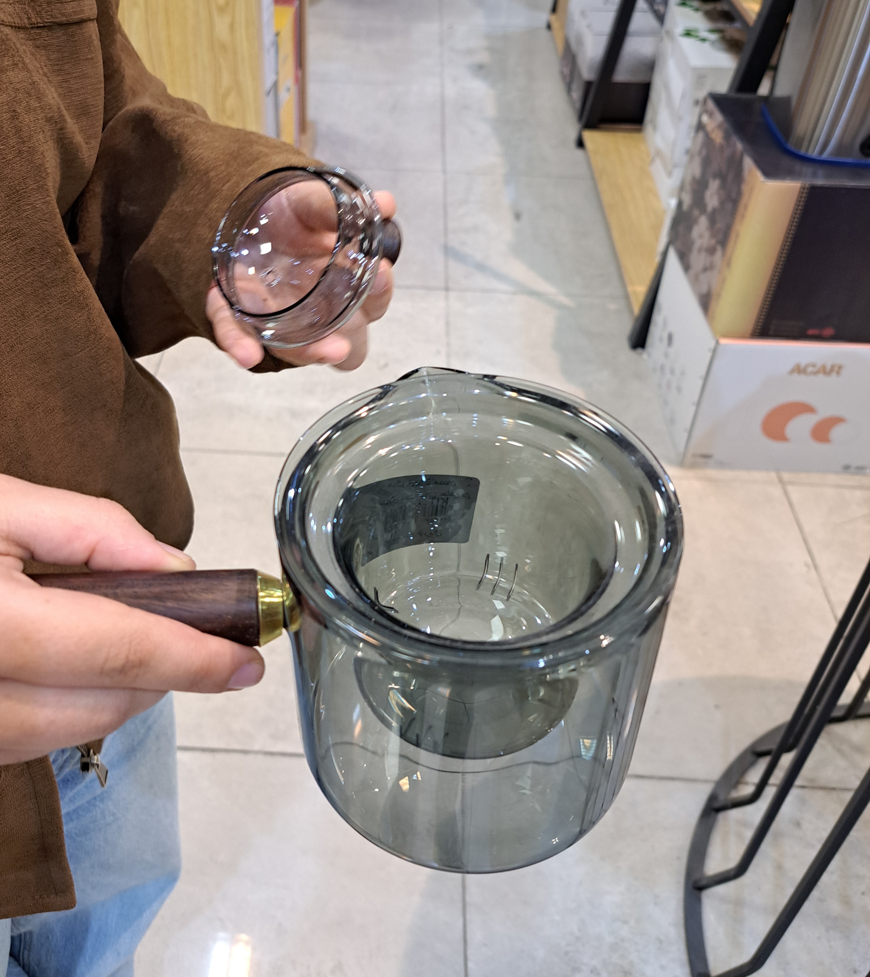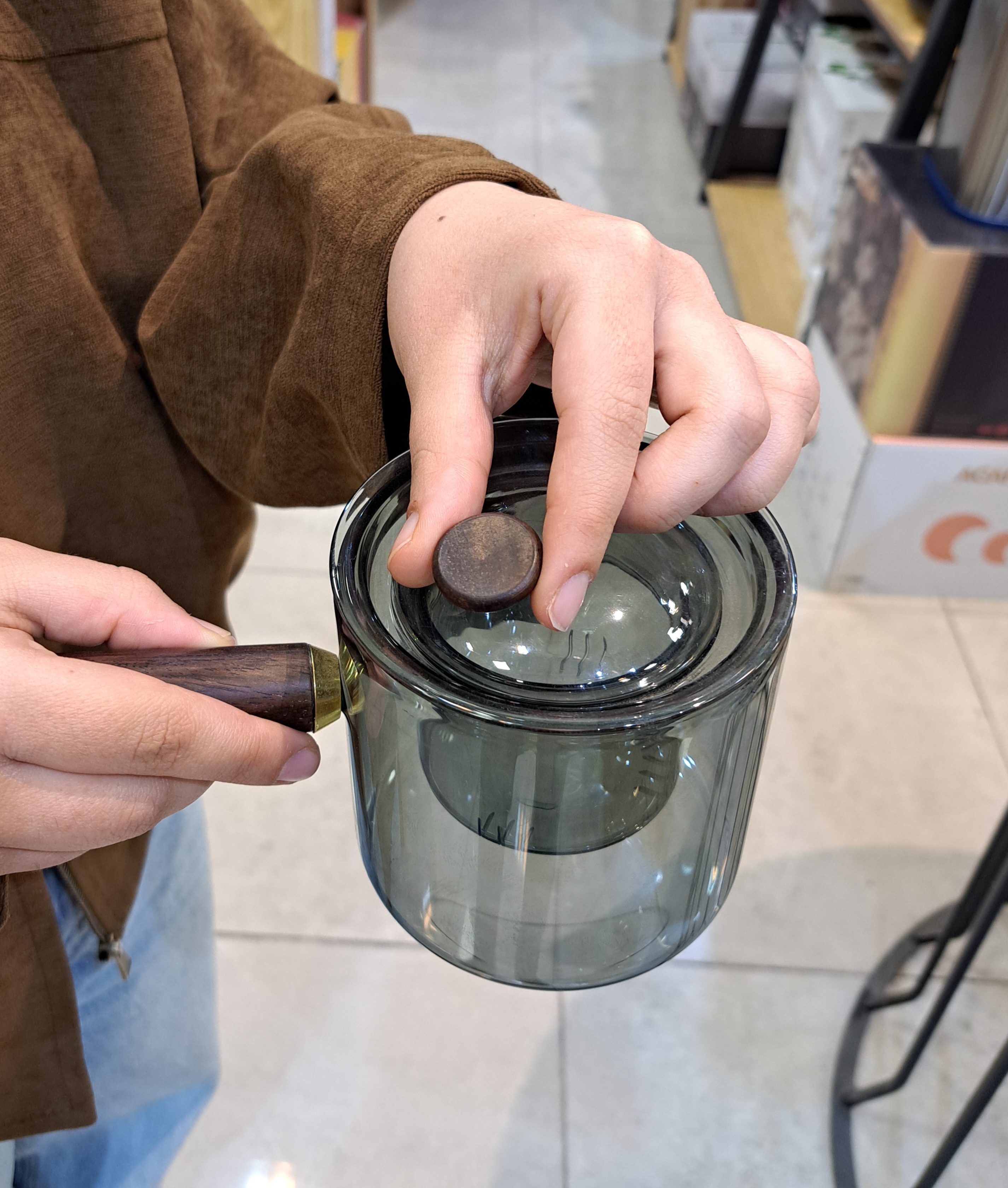 قوری دمنوش‌ساز پیرکس دودی تک دسته با صافی داخلی و دسته بامبو – مقاوم و شیک